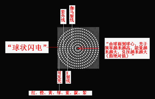 “棒電極”在球心對(duì)“球冠電極”“超短時(shí)間內(nèi)的高能”充電、放電,可以產(chǎn)生“球狀閃電”,其機(jī)理為:“雙向激擊”、“球冠振蕩”。因?yàn)椤扒蚬谡袷帯钡念l率的不同,“球狀閃電”內(nèi)部呈現(xiàn)“嵌套球狀”,由外向里頻率由小到大,在可見光波段由外向里顯現(xiàn)為紅、橙、黃、綠、藍(lán)、靛、紫,而由外向里看,因疊加合成呈現(xiàn)白色,但是,當(dāng)最外面的頻率較小時(shí),也可能是黃色或綠色或藍(lán)色的;一個(gè)大“光球”,可以分離為兩個(gè)或幾個(gè)小“光球”,但其顏色將會(huì)“變深”。[3][4]