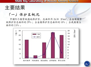 這是《科學(xué)通報(bào)》的封面,雙語(yǔ)的。下面簡(jiǎn)單匯報(bào)一下評(píng)估結(jié)果,中國(guó)91個(gè)國(guó)家級(jí)濕地保護(hù)區(qū),總面積為 26.38萬(wàn)km2,占全國(guó)國(guó)家級(jí)保護(hù)區(qū)總面積的 29% ;占全國(guó)保護(hù)區(qū)總面積的 18% ;占我國(guó)國(guó)土面積的 2.5% 。類(lèi)型來(lái)看,沼澤濕地保護(hù)區(qū)最多,其次野生動(dòng)物保護(hù)區(qū),第三個(gè)是海洋類(lèi)型,河流類(lèi)型最少的。