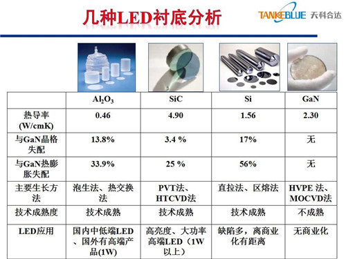 但是在這里面我們今天講的主要是藍(lán)寶石、碳化硅,剛才在講的時(shí)候我思考幾個(gè)問題,這幾個(gè)材料在發(fā)光效率上藍(lán)寶石可以做到150lm/W,碳化硅可以做到200lm/W,在發(fā)光效率上確實(shí)體現(xiàn)差異。在物理基礎(chǔ)參數(shù)上體現(xiàn)了差異,比如說跟氮化鎵外延,從晶格匹配上,碳化硅上長氮化鎵確實(shí)好一些,藍(lán)寶石失配大一些,直接影響外延的質(zhì)量。另外導(dǎo)電性、熱導(dǎo)率也是有差異的。