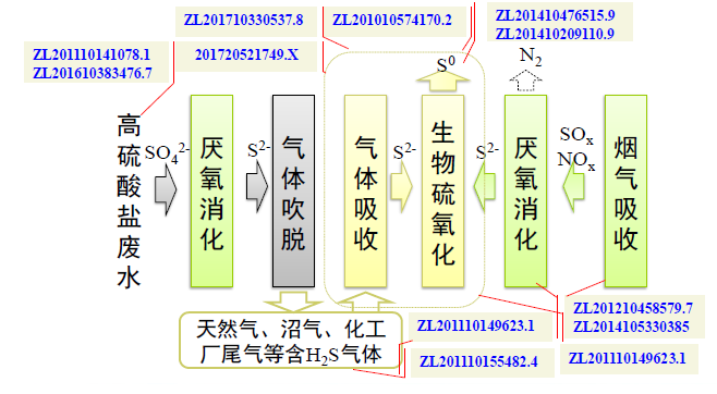 基于嗜鹽嗜堿硫氧化菌開發(fā)氣體生物脫硫及硫回收工藝,我們將其在高硫酸鹽廢水和煙氣脫硫脫硝中進(jìn)行應(yīng)用,并對(duì)關(guān)鍵流程的知識(shí)產(chǎn)權(quán)進(jìn)行了全面布局(圖1-8)。