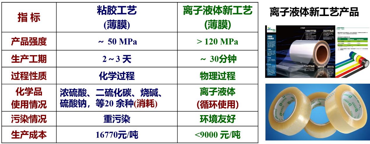 以前纖維素制膜工藝污染很大,中國(guó)逐漸在關(guān)停。而我們的離子液體工藝是物理溶解,基本沒有污染。原來(lái)工藝需要三天時(shí)間,現(xiàn)在三十分鐘就做出來(lái)了(圖8)。在車間里面都聞不到氣味,火都點(diǎn)不著,非常安全。其中溶劑是我們的專利,包括后面的溶劑回收,溶劑是可以回收再反復(fù)利用的。用我們這個(gè)工藝與企業(yè)合作建立了生產(chǎn)線,2019年基本已經(jīng)建成了,今年11月底試車。生產(chǎn)的產(chǎn)品推薦在快遞物流上使用,特別是用低成本秸稈做的膠帶,有很好的應(yīng)用前景。